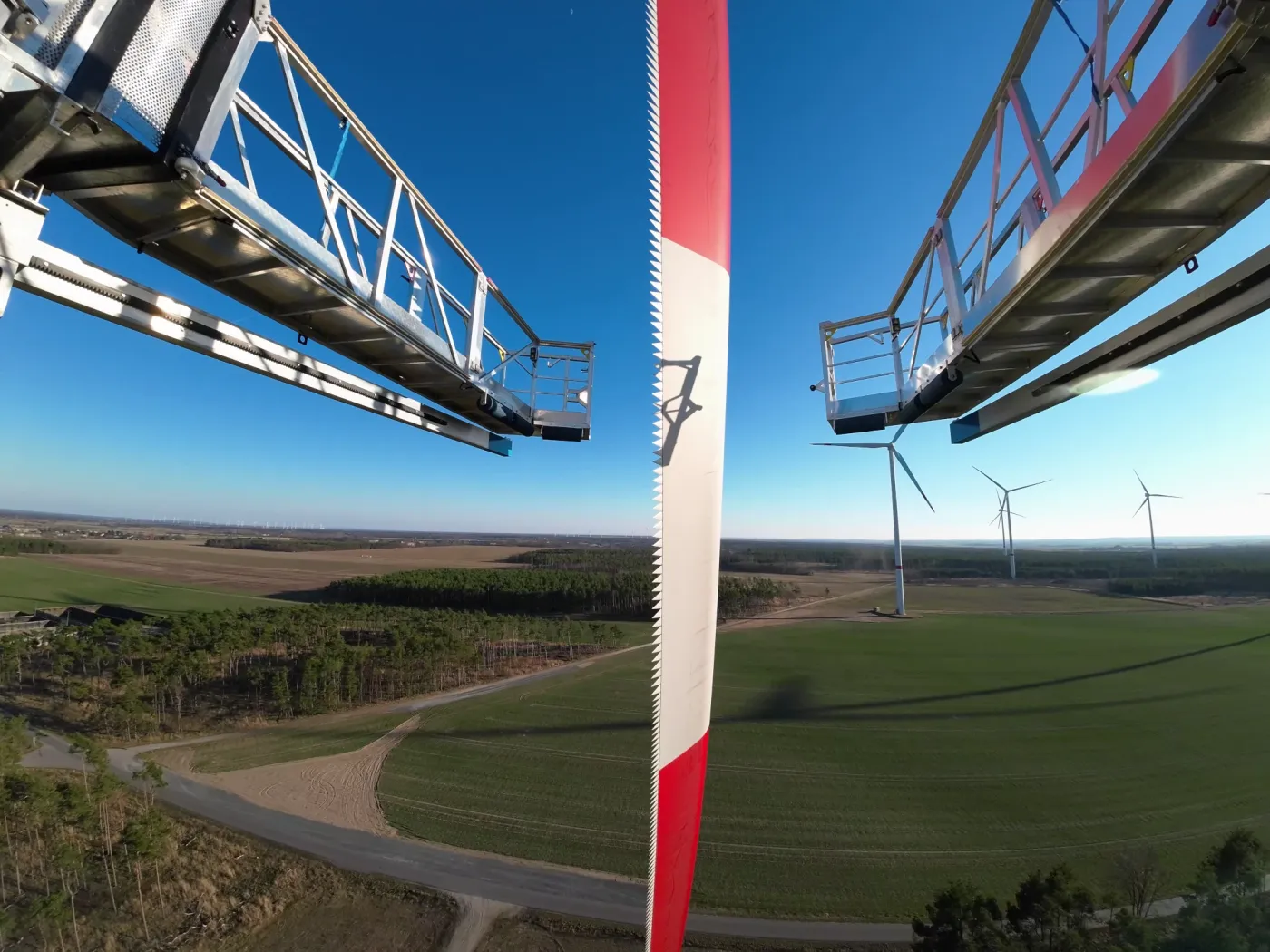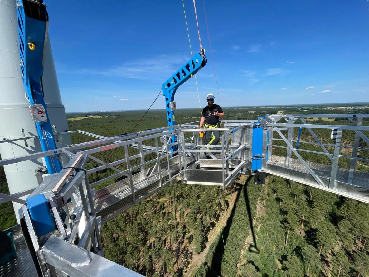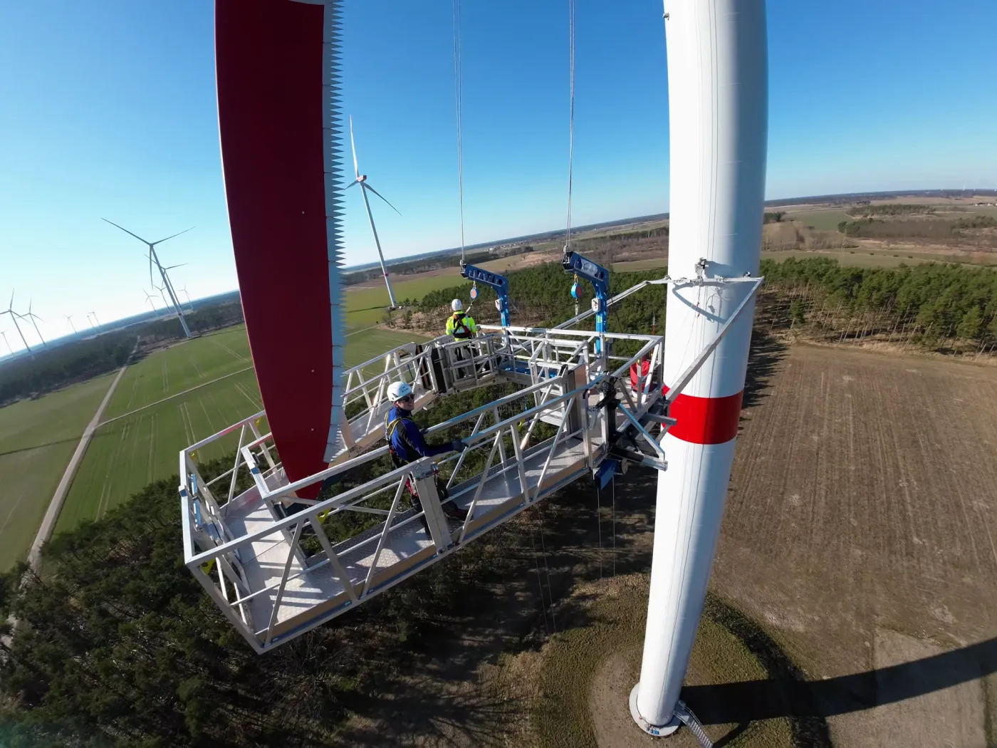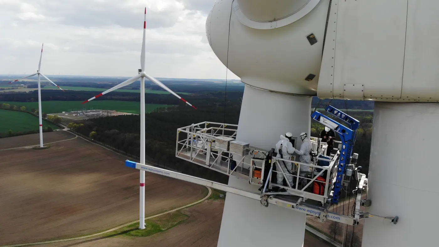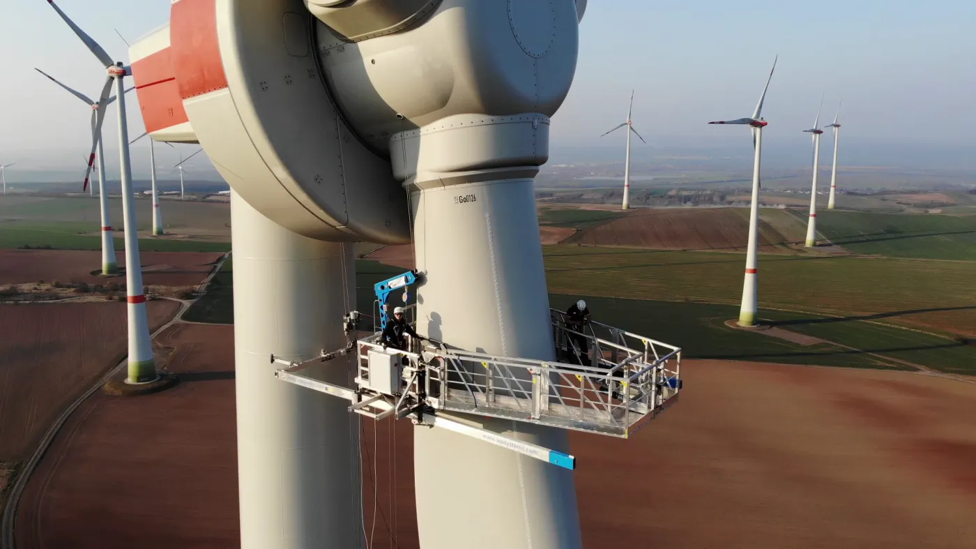 We apply cutting-edge development methods to design next-generation machines for the wind power sector. In addition to our enclosed maintenance system, we now also offer an open-access solution for rotor blade servicing.